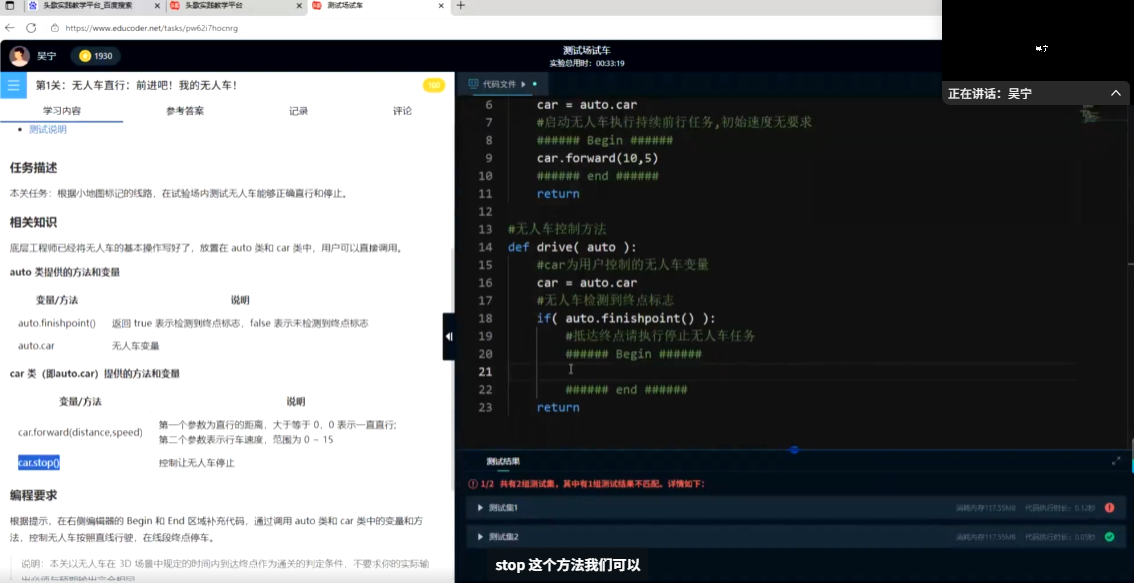 吴宁老师则以智能驾驶实验为切入点,聚焦技术落地的关键环节。他围绕 “感知 - 推理 - 执行” 全流程展开讲解,从传感器数据采集、环境建模,到路径规划与车辆控制,逐步拆解技术原理;同时借助虚拟仿真平台实时演示实验操作,清晰呈现参数调整、场景模拟等步骤,为教师开展实践教学提供可参考的操作范式。